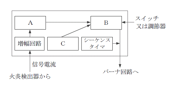 燃焼安全装置の主安全制御器の構成の一例を示す次の図において、[ ]内に入れるAからCまでの語句の組合せとして、適切なものは1~5のうちどれか。