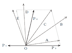 図のようにO点に三つの力P1、P2、P3が作用している場合に、これらの合力は次のうちどれか。