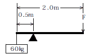 図のような「てこ」を使用して、質量60kgの荷を持ち上げたとき、これを支えるために必要な力Fは次のうちどれか。