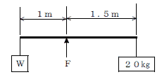 | 平成20年後期-問32 | 図のような天びんをつり合わせるための荷Wの質量とこれを支えるための力Fの組合せとして、正しいものは次のうちどれか。 ただし、重力の加速度は9.8m/s2とし、天びん棒の質量は考えないものとする。 |