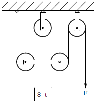 | 平成19年前期-問40 | 図のような組合せ滑車を使用し、質量8tの荷を支えるために必要な力Fは、次のうちどれか。 ただし、重力の加速度は9.8m/s2とし、滑車の質量、摩擦は考えないものとする。 |