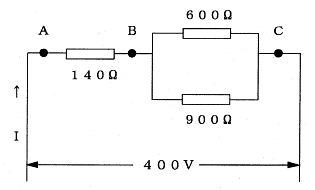 | 平成23年前期-問25 | 図のような回路について、BC間の合成抵抗Rの値と、AC間に400Vの電圧を加えたときに流れる電流Iの値の組合せとして、正しいものは1~5のうちどれか。 |
