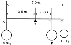 | 平成19年後期-問32 | 図において棒が支点Oでつり合っているとき、B点につり下げられたおもりPの質量は、次のうちどれか。 ただし、棒の質量は考えないものとする。 |