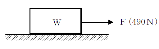 図のように、水平な床面に置いた質量Wの物体を床面に沿って引っ張り、動き始める直前の力Fの値が490Nであったとき、Wの値は1~5のうちどれか。