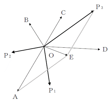 次に、A(P1とP2の合力)とP3の合力を求める。合力はEとなる。