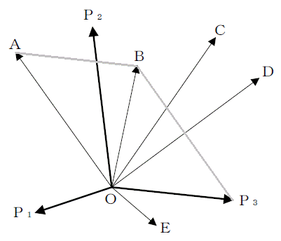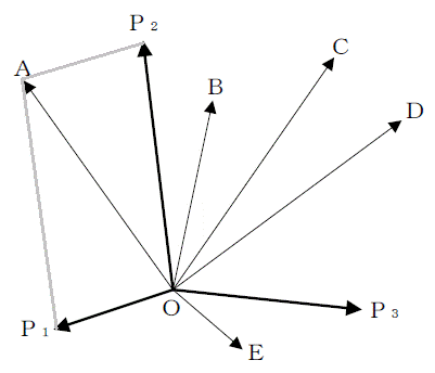 次に、A(P1とP2の合力)とP3の合力を求める。合力はBとなる。