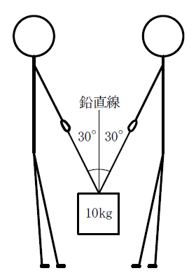 図のように質量10㎏の荷を同じ長さの2本のロープを用いて2人でそれぞれ鉛直線に対し30°の角度で引き上げ支えているとき、1人がロープを引く力の値に最も近いものは1~5のうちどれか。
