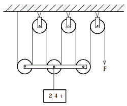 | 平成19年前期-問40 | 図のような組合せ滑車を使用し、質量8tの荷を支えるために必要な力Fは、次のうちどれか。 ただし、重力の加速度は9.8m/s2とし、滑車の質量、摩擦は考えないものとする。 |
