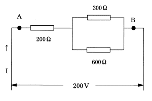 AB間の合成抵抗 R=200+{1/(1/300+1/600)}=400Ω