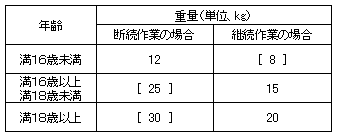 女性については、労働基準法により下の表の左欄の年齢に応じ右欄の重量以上の重量物を取り扱う業務に就かせてはならないとされている。