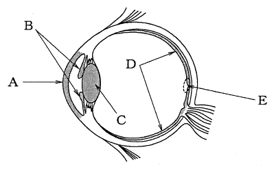 - Cの部分は水晶体で、これの厚さを変えることにより焦点距離を調節して網膜上に像を結ぶようにしている。