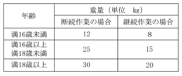 女性については、労働基準法により下の表の左欄の年齢に応じ右欄の重量以上の重量物を取り扱う業務に就かせてはならないとされている。
