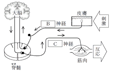 なお、図は、ヒトの体が刺激を受けて反応する時の、信号が伝わる経路を模式的に表したものである。