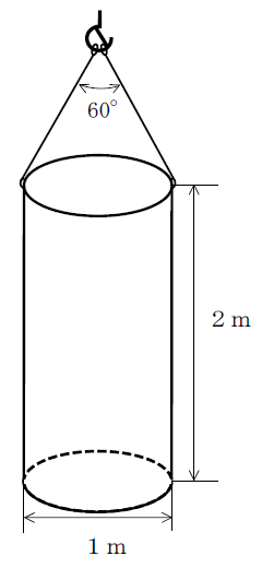 図のように、直径1m、高さ2mのアルミニウム製の円柱を同じ長さの2本の玉掛け用ワイヤロープを用いてつり角度60°でつるとき、1本のワイヤロープにかかる張力の値に最も近いものは1~5のうちどれか。ただし、アルミニウムの1m3当たりの質量は2.7t、重力の加速度は9.8m/s2とする。また、荷の左右のつり合いは取れており、左右のワイヤロープの張力は同じとし、ワイヤロープ及び荷のつり金具の質量は考えないものとする。 |