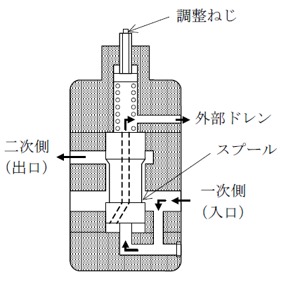 一次側(入口)の油圧が、スプールを押し下げているばね圧より大きくなると、スプールが押し上げられて、二次側(出口)が開く構造となっている。