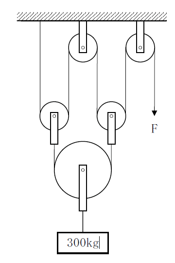 図のような組合せ滑車を用いて質量300㎏の荷をつるとき、これを支えるために必要な力Fの値は1~5のうちどれか。