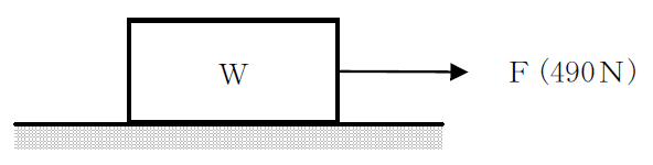 図のように、水平な床面に置いた質量Wの物体を床面に沿って引っ張り、動き始める直前の力Fの値が490Nであったとき、Wの値は1~5のうちどれか。