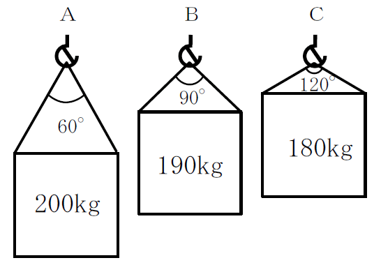 下記に掲げるAからCまでの図のとおり、同一形状で質量が異なる三つの荷を、それぞれ同じ長さの2本の玉掛け用ワイヤロープ(以下、本問において「ワイヤロープ」という。)を用いて、それぞれ異なるつり角度でつり上げるとき、これらの荷を、1本のワイヤロープにかかる張力の値が小さい順に並べたものは1~5のうちどれか。