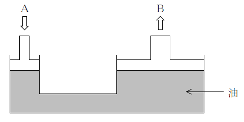 油で満たされた二つのシリンダが連絡している図の装置で、ピストンA(直径2㎝)に7Nの力を加えるとき、ピストンB(直径6㎝)に加わる力は1~5のうちどれか。