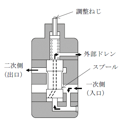 一次側(入口)の油圧が、スプールを押し下げているばね圧より大きくなると、スプールが押し上げられて、二次側(出口)が開く構造となっている。