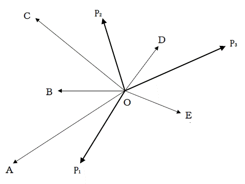 図のようにO点に同一平面上の三つの力P1、P2、P3が作用しているとき、これらの合力に最も近いものは1~5のうちどれか。