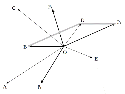 次に、B(P1とP2の合力)とP3の合力を求める。合力はDとなる。