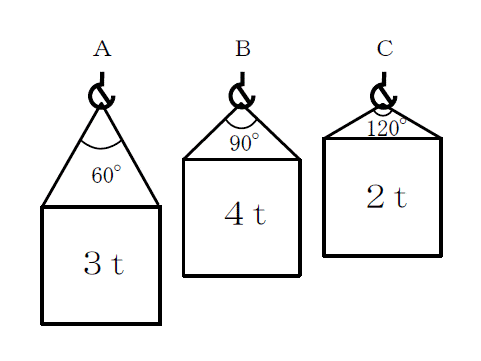 下記に掲げるAからCまでの図のとおり、同一形状で質量が異なる三つの荷を、それぞれ同じ長さの2本の玉掛け用ワイヤロープ(以下、本問において「ワイヤロープ」という。)を用いて、それぞれ異なるつり角度でつり上げるとき、これらの荷を、1本のワイヤロープにかかる張力の値が大きい順に並べたものは1~5のうちどれか。ただし、いずれも荷の左右のつり合いは取れており、左右のワイヤロープの張力は同じとし、ワイヤロープの質量は考えないものとする。 |
