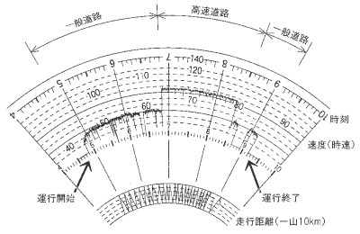 下図は、最大積載量10,000キログラム、車両総重量が19,810キログラムの貨物の運送の用に供する普通自動車である事業用自動車に備えられた運行記録計の記録を示したものであるが、下図に記録された当該自動車の運行を解析した次の記述のうち、正しいものをすべて選び、解答用紙の該当する欄にマークしなさい。
