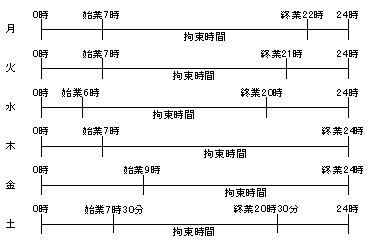 | 平成26年度臨時-問22 | 下図は、貨物自動車運送事業に従事する自動車運転者の1週間の勤務状況の例を示したものであるが、「自動車運転者の労働時間等の改善のための基準」(以下「改善基準」という。)に定める拘束時間等に関する次の記述のうち、正しいものを1つ選び、解答用紙の該当する欄にマークしなさい。ただし、1人乗務で、フェリーには乗船しないものとし、また、業務の必要上、勤務の終了後継続して、定められた時間以上の休息時間を与えることが困難な場合には該当しないものとする。 なお、日曜日は休日とする。 |
