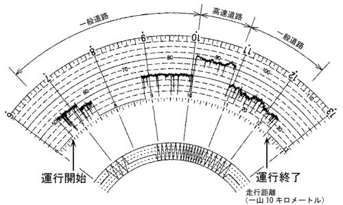 下図は、最大積載量9,000キログラム、車両総重量が18,500キログラムの貨物の運送の用に供する普通自動車である事業用自動車に備えられた運行記録計の記録を示したものであるが、下図に記録された当該自動車の運行を解析した次の記述のうち、正しいものをすべて選び、解答用紙の該当する欄にマークしなさい。ただし、ここで運行した一般道路及び高速自動車国道(以下「高速道路」という。)は道路標識等により最高速度が指定されていないものとする。