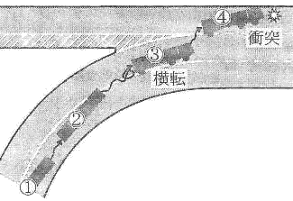 運転者は、営業所において運行管理者の行う乗務前の点呼を受け、午前4時に出庫し20キロリットルの燃料(比重:O.75)を積んだタンクセミトレーラー(最大積載量は16,000キログラム)をけん引して自動車専用道路を乗用車に続いて時速80キロメートルで走行中、道路が合流する右カーブの地点にさしかかったので、減速しようとブレーキをかけ、時速60キロメートルまで減速して当該カーブに進入したところ、バランスを崩して車体が左側に傾き横転し、そのまま側壁に衝突した。この事故で当該運転者が重傷を負った。