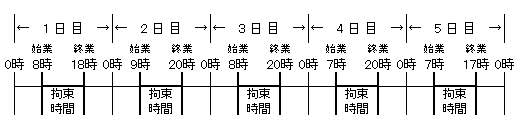| 平成24年度第2回-問23 | 下図は、貨物自動車運送事業に従事する自動車運転者の5日間の勤務状況の例を示したものであるが、「自動車運転者の労働時間等の改善のための基準」に基づく1日の拘束時間の次の組合せのうち、正しいものを1つ選び、解答用紙の該当する欄にマークしなさい。 |