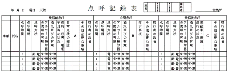 「貨物自動車運送事業輸送安全規則の解釈及び運用」によると、乗務前点呼、中間点呼、乗務後点呼の記録事項は次のように定められている。